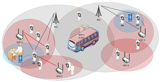 The concept of radio-environment-based proximity estimation is graphically presented in Figure 1. Different users are either in a similar or completely different radio environment. As an example, the radio environment of users U1 and U2 is (BS1;WiFi1) and (BS1;WiFi1,Wifi2;BT1), respectively. There is a certain radio environment overlap; however, as user U1 is not within BT1 and WiFi2, we can assume that the proximity is medium. U3 and U4 exhibit almost the same radio environment, thus the proximity is denoted as . Note that, if there is no common radio environment, there is no proximity and consequent “contact intensity” (i.e., users U1 and U3) which we denote as . As people are moving, their radio environment is changing in time. An interesting example is a bus with WiFi5 where the AP is moving with a bus; thus, the users which have the radio environment denoted as WiFi5 at the same time could be in close contact.