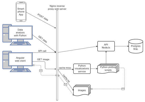 All interactions between the smart application and the back-end are handled via REST API, which is fronted by Nginx. All the operations on data and documentation are also handled through REST API which is implemented by the NodeJS Express [58] program. The data is managed by the Postgres SQL server [59] and interfacing with it is enabled only through the NodeJS server. Postgres was chosen because of its support for JSON storage and full-text search over documentation descriptions. Interaction in NodeJS with Postgres is performed using the Sequelize ORM (Object-Relational Mapper) library [60]. For further processing, data analysis, visualization, and proximity calculation, we use Python scripts that retrieve measurements via REST API. It is important to note that we developed the application only for Android phones from API 28 upwards.