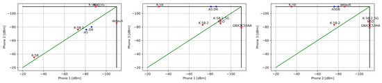 The graphical representation is depicted in Figure 3. The left figure shows the radio environment of Phone 1 (#1) and Phone 2 (#2), while the middle and right figures show the other two combinations. Please note that N/A is shown as −110 dBm for clarity. The WiFi signal is marked in red, while the BLE signal is in blue. The green diagonal line indicates where the same signal is received on both compared phones. In general, measurements closer to the green diagonal line (same RSSI on both phones) and closer to the lower left corner (higher RSSI) indicate close proximity.