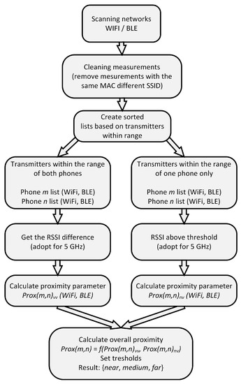 As we do not know the positions of the smartphones, the range of distance could be between (both phones on the same side) and (phones in opposite directions). Another issue is that, even at the same location, there is a small difference (a few dBm) between the RSSI measurements from different phones, particularly from different brands/chipsets used. Therefore, based on measurements, experiments, and heuristics, considering the radio propagation properties, we propose the procedure for proximity calculation presented in Figure 4. The main objective is to define three categories, denoted as: