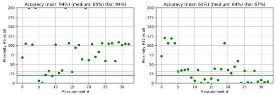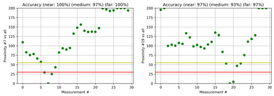 Figure 5 shows the two examples for the indoor environment. The red and yellow lines denote T1 and T2 thresholds, respectively; thus points below the red line are , points above the yellow line are , and points in between are . If the proximity is more than 200 or out of range, it is shown as 200. On the left side, we show the proximity of the measurement #7, where the accuracies for , and are 100%, 97% and 100%, respectively. On the right side, we show an example of the proximity of measurements to measurement #19, where the accuracies are 97%, 93% and 97%, respectively. The accuracy is high due to the large number of spaced-apart transmitters throughout the office buildings.