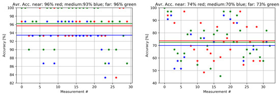 In the second set of results, the accuracy for a set of measurements in two real scenarios is shown in Figure 7. The accuracy of a single measurement is depicted as a red, blue, or green marker for , and paired devices, respectively. The average accuracy of the experiment is illustrated as straight color lines, namely red, blue, and green for , and paired devices, respectively. For the indoor environment (left side), the average accuracy for is 95.8%, while the average accuracy for is 93.4%, and the average accuracy for is 96.2%. For the outdoor environment (right side), the average accuracy for is 73.7%, while the average accuracy for is 70.0%, and the average accuracy for is 73.4%. As expected, the results for the indoor environments show significantly better results than for the outdoor environment where the accuracy is below 50% for some measurements with only one or two transmitters within range with a weak signal.