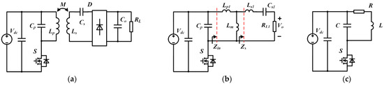 Figure 1c shows the simplified circuit model of the single-ended WPT system, with the equivalent circuit parameters computed as follows (Equations (11) to (13)):