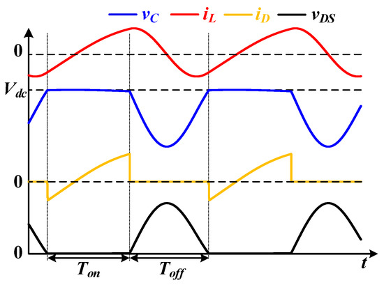 The idealized current and voltage waveforms of the converter are shown in Figure 2, which can explain the operation principle of the converter. Here, iL is the current through the inductor, vC is the voltage on the parallel capacitor, vDS is the drain-to-source voltage of the MOSFET, and iD is the current through the MOSFET. From Figure 2, it can be discovered that the MOSFET switches when the parallel capacitor voltage is equal to the input voltage, which contributes to its low switching-loss feature. By selecting the capacitor voltage vC and the inductor current iL as state variables, the state equations for the Toff period can be expressed as Equation (14).