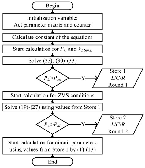 Figure 5 shows the flowchart of a parameter design process in MATLAB. If the range of parameters is given by system specification, the design procedure of the single-ended resonant converter can be developed as follows:
