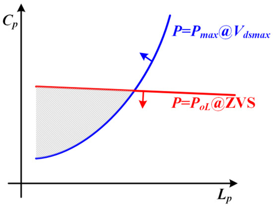 The blue line indicates the Lp and Cp parameter combination when the load power reaches Pmax and the drain-to-source voltage is fixed to VDSmax. The red line indicates the Lp and Cp parameter combination when the load power reaches PoL with critical ZVS conditions satisfied. As seen in the figure, the shaded area is the operating region satisfying both the maximum power requirement and the constraint of light load ZVS. Within this range, the larger the Lp, the smaller the primary current, which is conducive to reducing the current stress of the power semiconductor and the compensation capacitor, and beneficial to reduce the loss of resistance and improve conversion efficiency. Therefore, the optimized operation point can be selected at the right vertex of the region.
