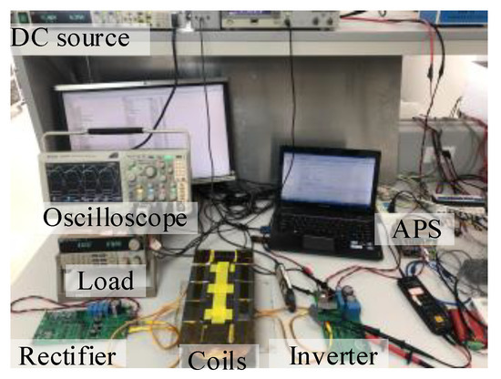 The simulations were performed using Simulink. Figure 7 shows a photograph of the 100 kHz power prototype used for measurements. The self-inductance of the coils and their resistance were measured at 100 kHz and 2 V. For the experimental set-up, the distance between the two coils was fixed at 52 mm, and the turns of coil were adjusted to achieve the desired self-inductance. Note that the parameters of the experimental set-up were calculated based on an input power of 25 W and an actual output power of about 20 W with a cascade voltage-regulation module.