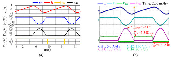 Simulation and experimentally obtained waveforms of single-ended resonant converter at Po = 25.495 W: (a) Simulated result; (b) experimental Result.