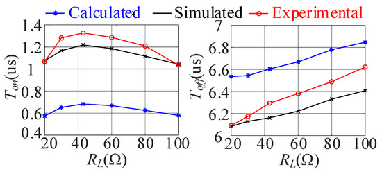Figure 9 shows the calculated, simulated, and experimental turn-on times and turn-off times to achieve ZVS under different load resistances. The calculated values are obviously smaller than the simulation and experimental results because of ignoring the non-ideal factors, such as circuit resistance, parasitic capacitance, and the forward voltage drop of the body diode. From the analysis of Figure 9, it can be seen that the analysis result is consistent with the change trend of the measured values. It is desirable to leave enough margin in the design specification to take into account parasitic parameters and duty-cycle losses caused by the delayed time. For example, the minimum light-load power for ZVS can be slightly reduced to ensure a robust design.