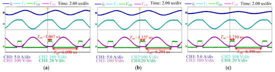 Experimental results to compare the ZVS behaviors under different load resistances: (a) RL= 20 Ω; (b) RL = 43 Ω; (c) RL = 80 Ω.