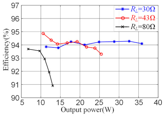 When the operation frequency is up to hundreds of kilohertz, probes can easily introduce additional amplitude and phase errors during the test. Thus, the instantaneous power of the resonant tank will be inaccurate. To estimate the efficiency of the single-ended resonant converter, the average output power of the DC source and the average power delivered to the load resistance were measured. Figure 11 shows the system’s efficiency over the output power range with different load resistances. The driving losses are not considered, and the peak efficiency of the proposed systems is 94.86%. Compared with other topologies, the proposed single-ended WPT system has the advantages of simple circuits, low cost, and easy implementation. It has the potential to be used in small- and medium-power consumer WPT applications.