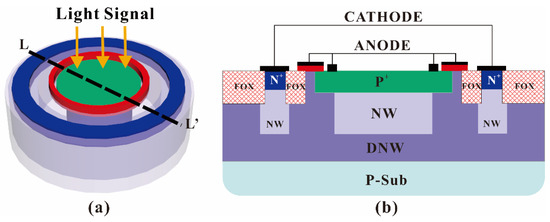 The three-dimensional structure and cross-section of the high-detection-efficiency photodiode device are shown in Figure 1a,b, respectively. The N+ ring injection regions on the left and right sides of the HDEPD are the cathode of the device, and the P+ ring injection region and the polysilicon ring gate in the middle are the anode of the device. When the potential difference between the cathode and anode of the device is greater than the avalanche breakdown threshold of P+/NW, the HDEPD operates in Geiger mode. At this time, the photon signal with an energy greater than the band gap of silicon material is incident on the avalanche multiplication region, and the electrons in the valence band of the device will absorb the photon energy to generate energy level transition, forming free electron–hole pairs. Under the excitation of the avalanche multiplication effect, the photogenerated carriers will continue to collide with the lattice, breaking the covalent bond and resulting in the originally fixed valence electrons becoming free electrons. Through the above reciprocating process, the device can realize the macroscopic current response under the incident condition of one photon.