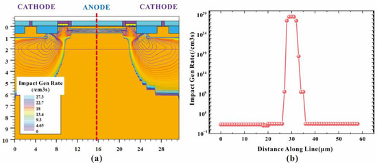 Two-dimensional impact ionization distribution of HDEPD device (a) and one-dimensional tangent distribution of impact ionization for HDEPD device (b).