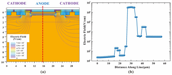 Two-dimensional electric field distribution of HDEPD device (a) and one-dimensional tangent distribution of electric field in HDEPD device (b).