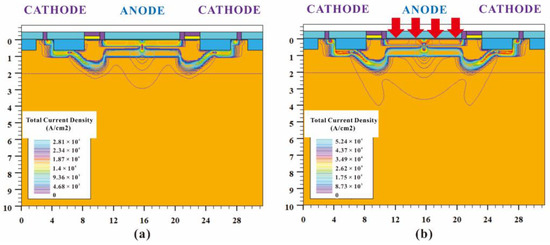 Current distribution of HDEPD device under light-free conditions (a) and current distribution of HDEPD device under light conditions (b).