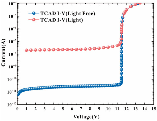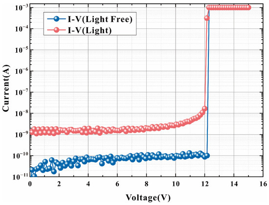 The measured I–V curve of HDEPD at room temperature (20 °C) is shown in Figure 8. The test conditions of the device are divided into two groups, the first group is light-free condition, and the second group is light condition (the wavelength of light source is 600 nm, and the optical power is 10 W/μm2). The avalanche breakdown voltage of HDEPD is 12.15 V, and the current density in the linear region is maintained at 10−11 A. After the avalanche effect is generated by dark carriers, the current density is doubled to the order of mA. When the light source is incident on the photosensitive region of the device, several photo-generated electron–hole pairs are excited by the incident photons, resulting in an increase in the magnitude of the current in the linear region of the device to 10−8 A. The measured results are completely consistent with the simulation results. In addition, the avalanche effect caused by photon signal also make the current density reach saturation state. The avalanche breakdown voltage of the device is not affected by the light conditions and is always maintained at 12.15 V. The I–V test results of HDEPD show that the gain of photocurrent is very stable in the linear region. The reason is that the polysilicon gate shorting the anode can further reduce the surface electron concentration of the dummy DNW guard ring so that the electric field force is concentrated in the central region of the photosensitive plane PN junction. When the electric field force tends to be stable, the orderly entry of photon signals can effectively realize the photoelectric conversion function of the device.
