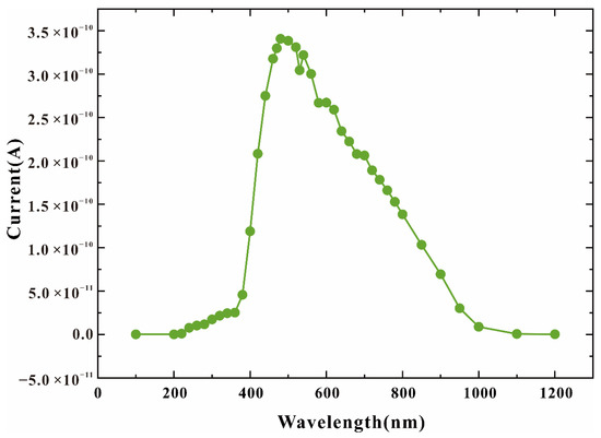 When HDEPD works in Geiger mode, the cathode is at a high potential, and the anode is at a low potential. The two-dimensional impact ionization distribution and one-dimensional impact ionization tangent distribution of the device are shown in Figure 2a,b, respectively. Meanwhile, the two-dimensional electric field distribution and one-dimensional electric field tangent distribution are shown in Figure 3a,b, respectively. According to the test results, it can be found that the peaks of the impact ionization distribution and electric field distribution of the device are concentrated in the central area of the photosensitive plane PN junction. The electric field force gathered by the side junction of P+ is small, and the guard ring can effectively prevent avalanche breakdown at the edge of the depletion layer, meaning that the device can work stably in Geiger mode to detect single-photon signals. In addition, the value of electric field force remains at 105 V/cm, indicating that the turn-on of the device depends on the avalanche breakdown rather than the tunnel breakdown. The current distribution of HDEPD under light-free conditions is shown in Figure 4a. The formation of the current path includes the cathode N+ injection region, NW, DNW, central NW and anode P+ injection region, and the peak value of current density is 2.81 × 104 A/cm2. When a photon signal with a wavelength of 600 nm is incident on the photosensitive region, as shown in Figure 4b, the current path of the device remains unchanged, and the peak value of the current density increases to 5.24 × 104 A/cm2. At this time, the total current density is the superposition of dark current and photocurrent. Whether it is the avalanche effect caused by dark carriers or the avalanche effect caused by photons, the current will reach the saturation state after doubling, as shown in Figure 5. The simulation results obtained for the one-dimensional I–V curve show that the dark current of the device in the linear region remains at 10−11 A under light-free conditions and surges to 10−8 A under light conditions. Both the two-dimensional current simulation results and the one-dimensional I–V simulation results of HDEPD verify the photomultiplier effect of the device. Finally, by coupling a photon signal with a wavelength of 100 nm~1200 nm to the photosensitive region and recording the current response under different wavelength conditions, the spectral simulation results of the device can be obtained, as shown in Figure 6. The coordinate position of the depletion layer of the device determines its spectral response range. The spectral peak of the avalanche multiplication region composed of P+ and NW is located at 400 nm~600 nm; that is, the simulation results conform to the design principle of the device.