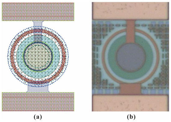 The HDEPD device is manufactured based on a 0.18 μm standard CMOS process, and the device can realize system integration without any mask correction. By establishing a quenching circuit junction spectroscopic detection instrument, the I–V characteristics, photon detection probability and dark count rate of the device can be tested. The diameter of the active region of HDEPD is 20 μm, and the layout and microscope images of the device are shown in Figure 7a,b, respectively.