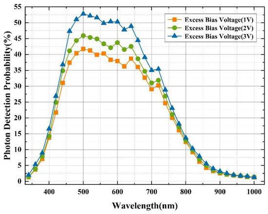 The photon detection probability of HDEPD can be obtained by a spectrometer combined with a quenching circuit. The test instrument is a xenon light source, and the wavelength range covers the visible light band. The resolution of the point light source is 1 nm, and the incident area of the light source is 1 mm2, which fully meets the size requirements of the photosensitive surface of the device. When the ambient temperature is 20 °C, the device is placed in the test bench and operated in Geiger mode with external electrical connections. In order to minimize the influence of irrational factors on the probability of photon detection, the current value of the device under excess bias voltage is first tested in a dark environment, and then its current value under light conditions is tested. Since the total current of the device includes dark current and photocurrent, DCR cannot be completely suppressed. Therefore, the final processed current value is the difference between the total device current and the dark current. At this time, when the optical power is constant, the PDP of the device at different wavelength conditions can be calculated, as shown in Figure 9. When the reverse excess bias voltage of HDEPD is 1 V, the device can achieve a 31% PDP in the wavelength range from 440 nm to 600 nm, and a peak of 41.7% at 500 nm. As the excess bias voltage increases to 3 V, the PDP of the device increases to 36.8% in the wavelength range of 440 nm~600 nm, and a peak of 52.8% at 500 nm.