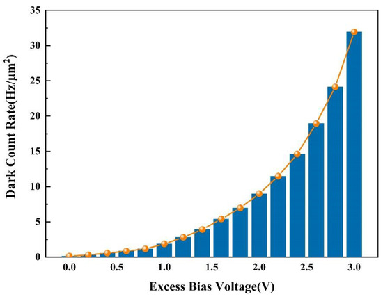 HDEPD adopts a passive quenching circuit combined with an oscilloscope, which can be used for DCR tests. The reverse excess bias voltage range of the device is 0~3 V, and the incremental step is 0.2 V. The dark count of the device at room temperature (20 °C) can be quantified by capturing the frequency peak of the avalanche pulse. In order to suppress the influence of noise signals on the experimental results, 10 groups of DCR under different bias conditions were tested, and the results were taken as the average, as shown in Figure 10. When the reverse excess bias voltage was 1 V, the DCR of the device was 1.8 Hz/μm2. When the reverse excess bias voltage was 3 V, the DCR of the device increased to 31.9 Hz/μm2. The test results show that the DCR had an exponential upward trend with the gradual increase in the voltage. HDEPD had a polysilicon ring gate, which could effectively isolate the STI from the multiplication region to suppress the energy level capture effect caused by material defects. In addition, wrapping the active region of the device with DNW could also isolate the contribution of substrate noise carriers to dark counts. Finally, on the premise of a lower breakdown voltage, HDEPD achieved a 52.8% PDP at the wavelength of 500 nm, and the DCR was 31.9 Hz/μm2. The above test data fully meet the detection requirements of the target application and can effectively improve the detection accuracy of the fluorescence spectrum analyzer and realize the high-precision measurement of Cd (II). Table 1 shows a data comparison between the detection efficiency of HDEPD and the reference device, further validating its high detection efficiency characteristics.