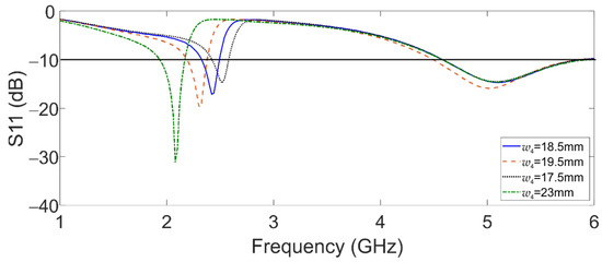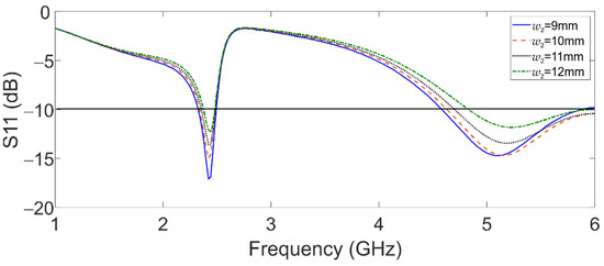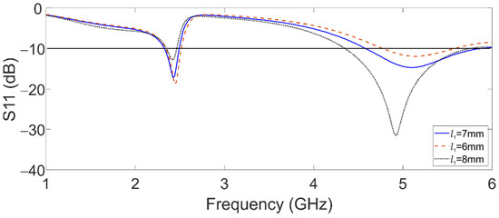 Moreover, Figure 3 shows the effect of w2 over the upper band (5.8 GHz). Concerning this case, while w2 is reduced, S11 decreases, and the lowest frequency of this band shifts to the left. Finally, l01 affects both bands concerning the coupling, as shown in Figure 4.