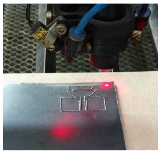 The first step of fabricating the antenna was to record a mask of the desired geometry over the graphene foil using a laser cutter (SMTRobotic, 1390BT, China), as shown in Figure 5. Then with a double sided adhesive paper, the graphene mask of the antenna was placed over the glass substrate. In addition, to connect the antenna, an SMA connector was employed. Figure 6 shows the fabricated antenna.