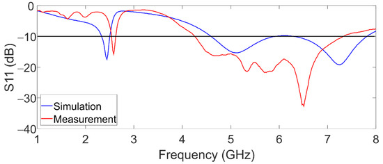 In other to start the characterization of the antenna, the antenna was connected to a Vector Network Analyzer (VectorStart, Anritsu, Morgan Hill, CA, USA) to measure its reflection coefficient (S11) from 1 to 8 GHz. The simulated and measured reflection coefficients are compared and shown in Figure 7. The measurement S11 suffers a shift of 150 MHZ for the first band, and the resonance frequency is at 2.6 GHz. The second band in the measurement starts at 4.3 GHz and ends at 7.1 GHz. These frequency shifts and differences between simulation and measurement are due to the variations in the dielectric properties of the glass substrate, and in a lower proportion to fabrication flaws. However, the bandwidth increase in the second band relates to the conductivity of the graphene in antennas with radiation elements with low conductivity such as ITO [16,17], present, and UWB behavior. The simulation and measurement are in concordance with the behavior of S11. Table 3 shows the fraction bandwidth for each band.