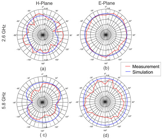 Simulated and measured radiation patterns: (a) H-plane 2.6 GHz, (b) E-plane 2.6 GHz, (c) H-plane 5.8 GHz, and (d) E-plane 5.8 GHz.