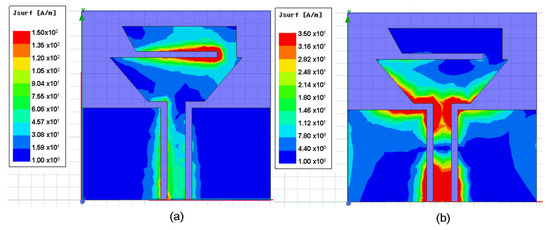 Finally, the current distribution for the graphene antenna was simulated at 2.45 GHz and 5.8 GHz and is shown in Figure 9. Figure 9a shows that the current distribution at 2.45 GHz is more intense in the second trapezoidal patch that corresponds to the lower frequency band. Moreover, at 5.8 GHz, the distribution current is mainly on the smallest base of the first trapezoidal patch; as was mentioned, this base controls the upper band of the antenna.
