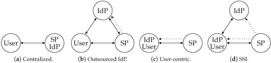 In the early days of the web, SPs had to implement their own IAM solutions to identify and authenticate clients to offer personalized products and services. As a result, these services are referred to as centralized authorities. This model presented a number of usability issues for users. Most users ended up using similar low-entropy passwords on different systems, making room for numerous vulnerabilities. This model has sparked numerous initiatives aimed at educating users about the dangers of using simple passwords and reusing them across multiple services [35,36].