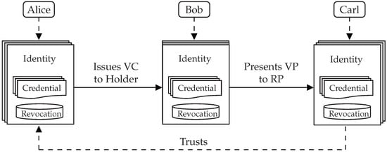 In Figure 2, we illustrate the end-to-end process of issuing a VC and emitting a VP in a simplified three-actor model. In this example, three individuals own and control their electronic identities, each of which is appropriate for a particular situation. Each electronic identity is linked to a database of issued and received credentials, as well as a revocation registry for expired or revoked credentials. One of Alice’s electronic identities issues a credential to one of Bob’s electronic identities, such as a declaration that he is a reputable seller of fine wines. Bob then creates and sends a VP to Carl, proving that he possesses a credential attesting to his good reputation. Carl has trust in the issuer of the credential from which that VP was derived, Alice, an internationally renowned winemaker. Carl then begins negotiating with Bob. It should be noted that, in reality, the majority of people will not host revocation registries because they do not issue credentials, which is also the case for physical and digital identification documents.