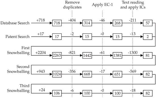 Our three-phase study selection process was executed five times, as presented in Figure 3. We applied the first execution to the outputs of the database search and the second to the patent search results. The combined output was a set of fifty-nine works which formed the input set for both forward and backward snowballing [89]. In short, backward snowballing consists of reviewing all references in a document, while forward snowballing finds other works that reference it. The snowballing was repeated until no new work was found that satisfied our selection process, which required three runs. The remaining eighty-two works constitute our result set. We should point out that two researchers independently assessed each paper at every stage of the selection process, and a conflict resolution meeting was organized. We point the interested reader elsewhere [90] for the complete list of papers, our evaluation regarding their inclusion or exclusion for all five runs of the study selection process, and the data extracted with the collection form.