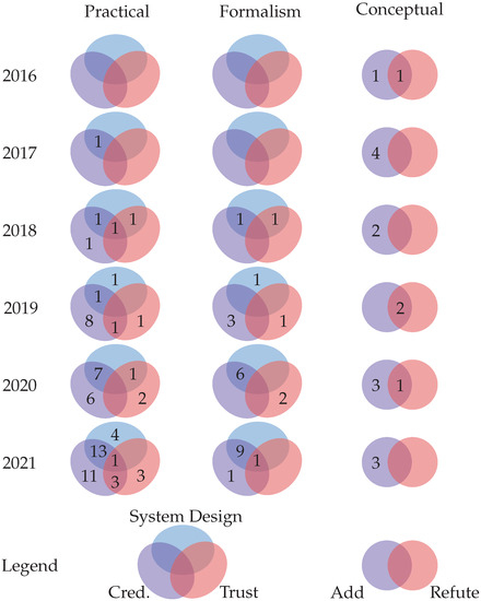 Čučko et al. [10] presented a systematic map of decentralized identity. They mapped one hundred and twenty papers in total, but only eighty were determined to be SSI-related. While they established a category for conceptual contributions, it was filled up with surveys and research articles highlighting SSI’s challenges and opportunities. Alternatively, we consider conceptual contributions that refute or include new philosophical perspectives on what SSI is. Their map encompasses information technology fields and the various domains to which SSI is applied, whereas our maps depict author–publication relationships.