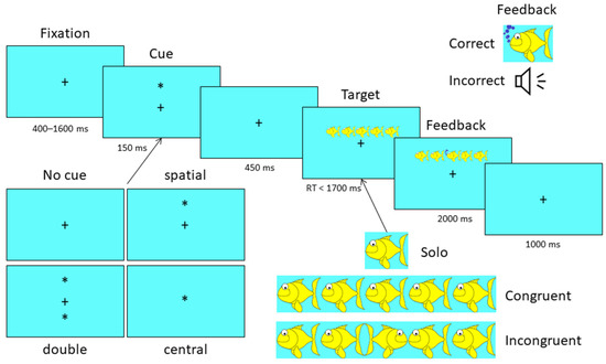 The child version of the ANT (see Figure 1) was employed to assess attention [32]. For each trial, the child was presented with a visual fixation cross on a blue background screen. Following a variable delay (400–1600 ms), one of four cue (duration 150 ms) conditions indicating where to attend was presented (1. No cue, 2. Spatial cue—attend either above or below fixation, 3. Double cue—attend above and below fixation, or 4. Attend centrally). Following a 400 ms delay, target stimuli were presented, which consisted of a line drawing of five yellow fish with the four flanking fish facing either all to the left or all to the right. The central fish also faced either to the left or right, but an equal number of trials were presented, where the central fish was congruent with the flanking fish or incongruent with the flanking fish. The task was to decide whether the middle fish was pointing to the left or right with a button press. The children were instructed to “feed the fish” by deciding what direction the middle fish was pointing (left or right). The children received feedback (video of the fish chewing with bubbles emerging for correct or beep for incorrect). An additional condition presented the central fish without any flanking fish (solo). Fish were presented above or below fixation to the attended or unattended location. Task duration was ~15 min.