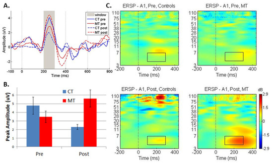 (A) The group averaged ERP waveform from the midline fronto-central averaged EEG electrodes for the pre-/post-training EEG sessions for controls (CT) and music trained (MT) participants. The peak latencies and amplitudes were chosen from the 200–300 ms time window (gray shading) using ERPlab. (B) The average peak amplitude of the positive peak in the 200–300 ms time window for pre-/post- EEG sessions. Error bars represent standard error of the mean. (C) Pre- (top) and post- (bottom) ERSPs for control (left) and MT (right) groups are shown with the black box denoting the time frequency window of mean theta power evaluated for group by time point-interactions. The ERSP for the A1 electrode is shown.