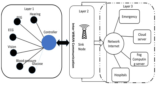 WBASN connectivity architecture, the connectivity architecture of the WBASN monitoring system, is depicted in Table 3 and Figure 2. As the Figure 2 shows, the sensor attached human body. Electroencephalograms (EEGs) [41], electrocardiograms (ECGs), electromyography’s (EMGs), and blood pressure monitors are all examples of sensors. A dish or base station was used to transmit the sensor data to the central server (BS). A medical doctor, a medical clinic, or a medical library may then use this information to acquire additional information and diagnose a disease.