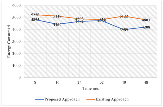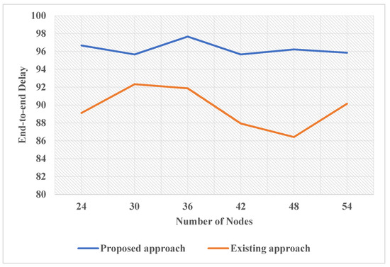 Figure 8 describes the change in End-to-End delay as the number of nodes of the existing approach and the proposed approach increases. As it is shown, the end-to-end delay in the existing approach is overall less as the number of nodes increases than the proposed approach, which makes the proposed approach more efficient. Along with that, the proposed approach shows consistency as the number of nodes increases. The curve is consistent and not very variable in the case of the proposed approach, whereas for the existing approach, the curve is inconsistent as it goes up and down for an increasing number of nodes, which is unstable. Therefore, the proposed approach performs better and is more stable, consistent and efficient than the existing approach.