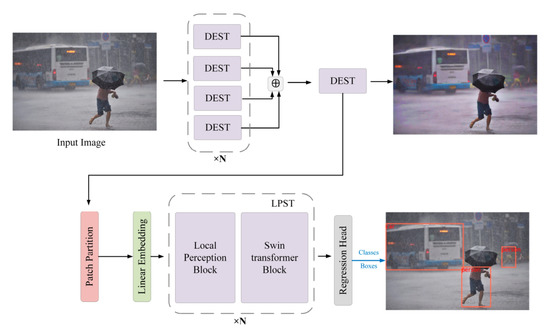 This section focuses on the network structure of the pedestrian and vehicle detection section. Compared with the most commonly used CNN-based detection algorithm, this paper used a hierarchical vision The Transformer object detection algorithm was based on the shifted window, which is the latest Swin Transformer [50] framework. The model feeds the features extracted from the deraining part to the LPST backbone network. The detection algorithm flow is shown in Figure 4. Similar to the Swin Transformer, there are two, two, six, and two blocks per stage.