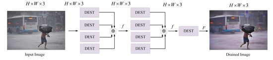 - A deraining model (DEST) was designed based on the Swin Transformer block. In addition, a four-branch feature fusion network structure was proposed to improve the quality of feature extraction.