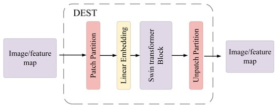 Inspired by the Swin Transformer, our DEST module design is shown in Figure 3. According to the structure of the Swin Transformer, we added an Unpatch Partition operation after the Swin Transformer block. This is the opposite operation of patch partition, so the output image or feature is the same size as the input image.
