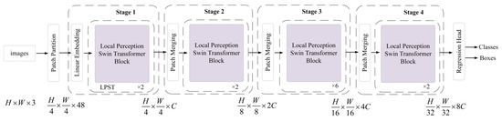 First, given a derained image I of size , the input image is divided into a set of non-overlapping patches by patch partition. The size of each patch is , the feature dimension is , and the number is . Then, by linear embedding, each patch is treated as a “token” and its feature is set as a concatenation of the raw pixel RGB values. After the feature dimension of the divided patch token is changed to , it is fed into LPST blocks at different stages for encoding. Then, the input is merged according to the adjacent patches of , so the number of patch blocks becomes and the feature dimension becomes . This step is repeated N times in each stage until the number of patch blocks becomes and the feature dimension becomes . Then, the regression head is sent for object classification and positioning regression. Each stage consists of a patch merging block or a linear embedding block and some local perception Swin Transformer blocks.