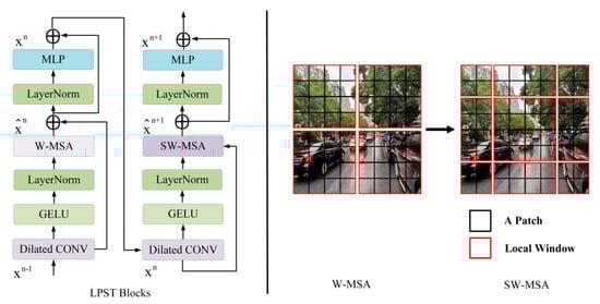 The Swin Transformer builds a hierarchical Transformer and implements attention operations on each window without overlapping. However, the Swin Transformer is limited in its ability to encode contextual information. To enhance the network’s learning about local correlation and structure information, we propose a local perception Swin Transformer (LPST). As shown to the left of Figure 5, each LPST block is composed of two consecutive improved Swin Transformer blocks. A layer of 3 × 3 dilated convolution (dilation = 2) and a GELU activation function is added in front of the LayerNorm layer.