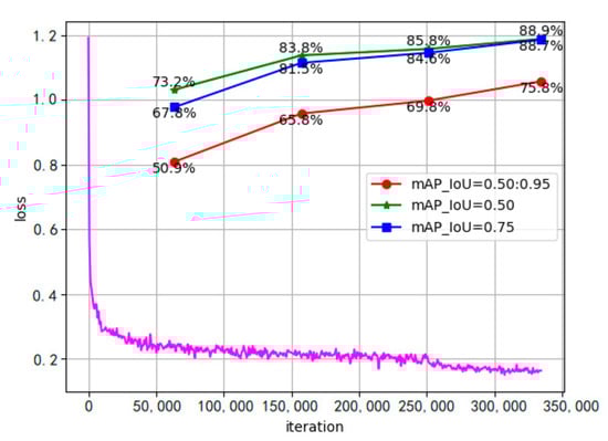 To train the detector, we adopted the method of transfer learning. The detection model was initialized with the deraining model and the Swin Transformer model pretrained on ImageNet, respectively. The optimizer used the AdamW algorithm based on weight attenuation, and the initial learning rate was set as . Using the linear learning rate decay method, the weight was set to decay 0.01 every 1500 iterations. In addition, random horizontal flipping, random scaling, and random photometric distortion were performed in the [0.5, 2.0] scale range for each image. The model performed 330,000 iterations on eight RTX 2080Ti graphics cards, with the first 250,000 iterations freezing the deraining model. It took 78 h for the model to converge. The loss function curve is shown in Figure 6, and the loss value eventually dropped to 0.18. In the case of IoU = 0.50, the mAP value reached 88.9%.