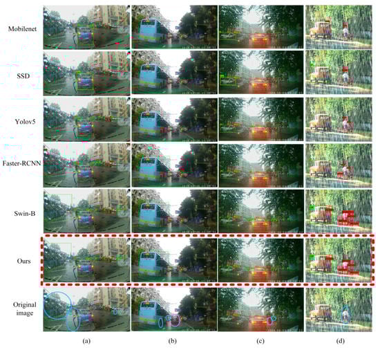 For the detection effect on rainy days, due to visual constraints, the recall rate of Mobilenet and SSD was very low. Most objects could not be detected, especially small-scale pedestrians and vehicles. Yolov5 and Faster-RCNN were slightly better than the first two algorithms, but the ratio of missed and false detection was still large. The precision and recall rate of version B of Swin Transformer (Swin-B) were significantly better than the previous four methods. We also compared Swin-B with the PVformer algorithm, focusing on the part circled in the original image, which is shown in the last row of Figure 8. Blue circles represent false detections, and pink circles represent missed detections. The comparison showed that PVformer can detect pedestrians and vehicles more accurately in rainy scenes.