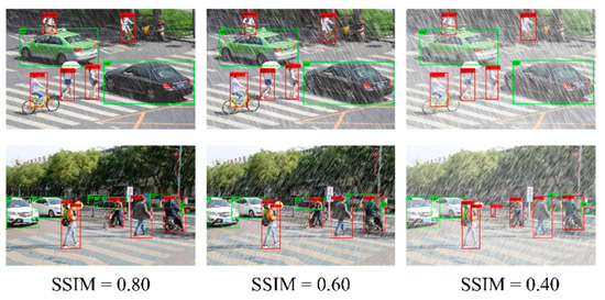 The SSIM value represents the degree of added noise. In order to verify the influence of noise on the proposed algorithm, artificially adding noise was used to simulate rainy days for testing. As shown in Figure 9, different SSIM values represent the strength of rain. Experiments showed that PVformer had good adaptability to different degrees of rain, reflecting strong robustness.