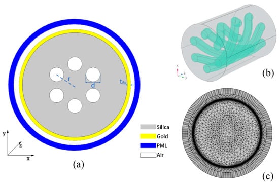 The cross-section structure of the designed HMSF is shown in Figure 1a. The diameter of the HMSF is 125 μm, including six large-aperture air holes, the distance from the center of the air hole to the fiber center is r = 25 μm, and the diameter of the air holes is d = 17 μm. The outer surface of the fiber is coated with a thin gold film, which has a thickness of tAu = 30 nm. The 3D helical structure of the optical fiber is shown in Figure 1b, and the pitch of the HMSF is set as L = 10 mm. Considering that the fiber is exposed to air during twist sensing and the influence of the material outside the gold film of the fiber cannot be ignored, a 10 μm air layer was added on the outside of the gold film in the simulation calculations with the COMSOL Multiphysics software. A PML layer was added outside the air layer as a boundary for the calculations. The meshing is shown in Figure 1c. The complete grid contains 213,530 domain units and 19,173 boundary elements. It should be noted that the initial value of the helix angle added for the fiber interior and the gold film is different in the calculation.