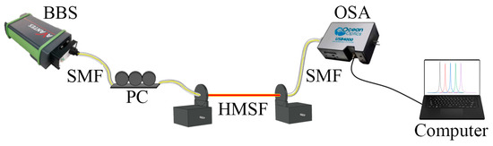 The experimental device is shown in Figure 2 schematically. The whole system consists of a broadband light source (BBS), a polarization controller (PC), an optical spectrum analyzer (OSA), two rotatable optical fiber clamps and a computer. During the experiment, the HMSF should be welded with the jumpers at both ends, then fixed on the fixture. An HMSF that is slightly longer than the required length is needed to ensure the distance between the two fixtures is correct. Special care should be taken to make sure that the fixtures are firmly fixed to HMSF, thereby all the twist force applied later by the fixtures can be put on the HMSF as much as possible. By satisfying these details in experiment, the potential interference resulting from the twisted jumper without a helix at both ends can be eliminated. In addition, the torsional strength of the fiber fusion point does not become a bottleneck of the measurement. After the light emitted by the BBS passes through the polarization controller, only one suitable polarization direction is retained to make the light propagate into the helical microstructure fiber (HMSF). The emergent light is received by the OSA at the other end and finally detected by a computer. The helix to the fiber can be applied by slowly adjusting the knob on the fixtures. We can observe and record the spectral changes under different twist angles, and then process the data to obtain the twist sensitivity of the sensor.