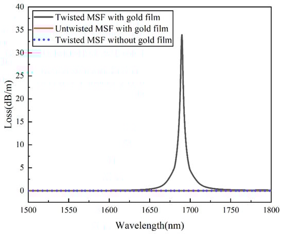 Comparison of the losses of HMSF with gold film, untwisted MSF with gold film, and HMSF without gold film.