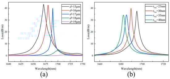 In order to analyze the influence of the structural parameters on the confinement loss of the gold-film-coated HMSF, the pore diameters d or the gold film thicknesses tAu are adjusted while other parameters remain the same. The confinement losses for the gold-film-coated HMSF with the same gold film thicknesses tAu = 30 nm but different air hole diameters d are shown in Figure 4a. When d ≥ 18 μm, the air hole has a strong energy binding ability, which restricts the escape of light from the core to the cladding, resulting in a weak SPR effect and inconspicuous loss peaks. When 15 μm ≤ d ≤ 17 μm, the narrowing of the air hole weakens the cladding’s restraint, thereby allowing more energy to escape from the core to the cladding region. The light in the cladding is totally reflected to the surface of the outer gold film and interacts with the free electrons, then the surface plasmon polaritons (SPP) mode is generated. When the refractive indices of the fundamental mode and the SPP mode reach the matching point, the excitation of the surface plasmon mode on the surface of the gold film produces an obvious loss peak. With the increase in the air hole diameter, the effective refractive index of the core decreases, the phase changes, and the position of the loss peak will red-shift. When d increases from 15 to 17 μm, the confinement of the air hole to the core increases, and the difficulty of phase matching increases, eventually resulting in a decrease in the full width at half maximum of the loss peak.