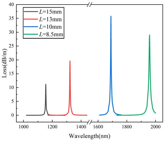 In addition, it is important to choose a suitable initial pitch L, since the characteristics of HMSF are highly related to the pitch. The confinement losses for the gold-film-coated HMSF with the same air hole diameters d = 17 μm, the same gold film thicknesses tAu = 30 nm, but different pitch L are shown in Figure 5. When the pitch L is large, that is, the helix is small, the air hole still has a strong binding ability to the fiber core, and only a small amount of energy can overflow to trigger the SPR effect with the gold film, so the loss peak is low. When the helical pitch L is small, although a good loss peak can still be generated, the resonance wavelength in the sensing will exceed 2000 nm, which is beyond the range of general light sources and is not conducive to experimental research. Therefore, the pitch L = 10 mm was selected for the following research.